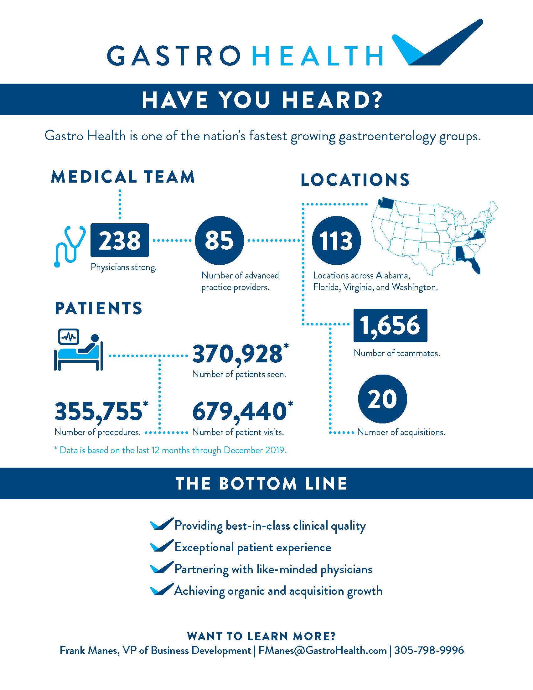 With locations across the country in Alabama, Florida, Maryland, Ohio, Virginia, and Washington and with over 240 physicians, Gastro Health is one of the nation’s fastest-growing gastroenterology groups. We hope to continue our growth by partnering with like-minded physicians who aim to provide their communities with the best possible care available.